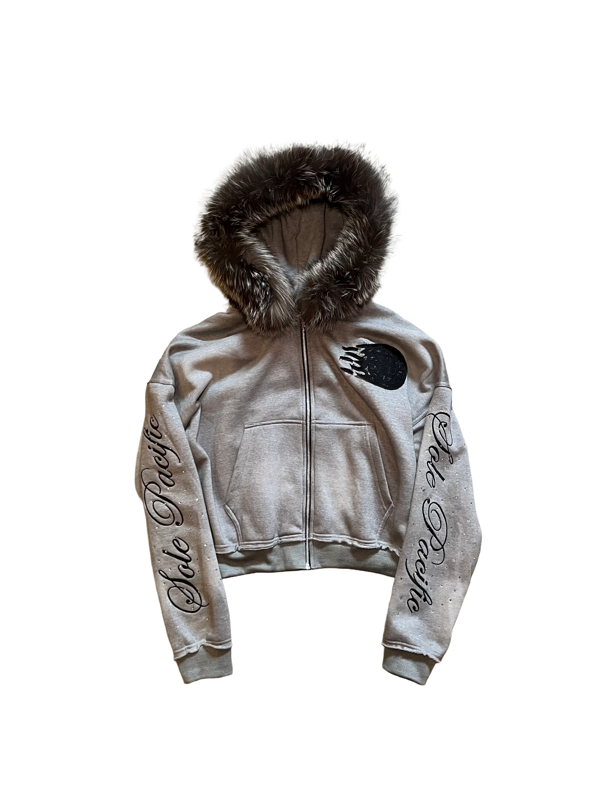 Sole Pacific returns with a familiar colorway, The Cursive Tracksuit. This set introduces a distressed double waistband for layered depth, while a detachable fur hood adds versatility and edge. Along the sleeves and legs, rhinestone detailing catches the light, contrasted by sleek black embroidery of the Sole Pacific logo on the chest, back, and thigh. The sleeves and legs are further elevated with engraved Sole Pacific embroidery in black, reinforcing the brand’s signature identity.