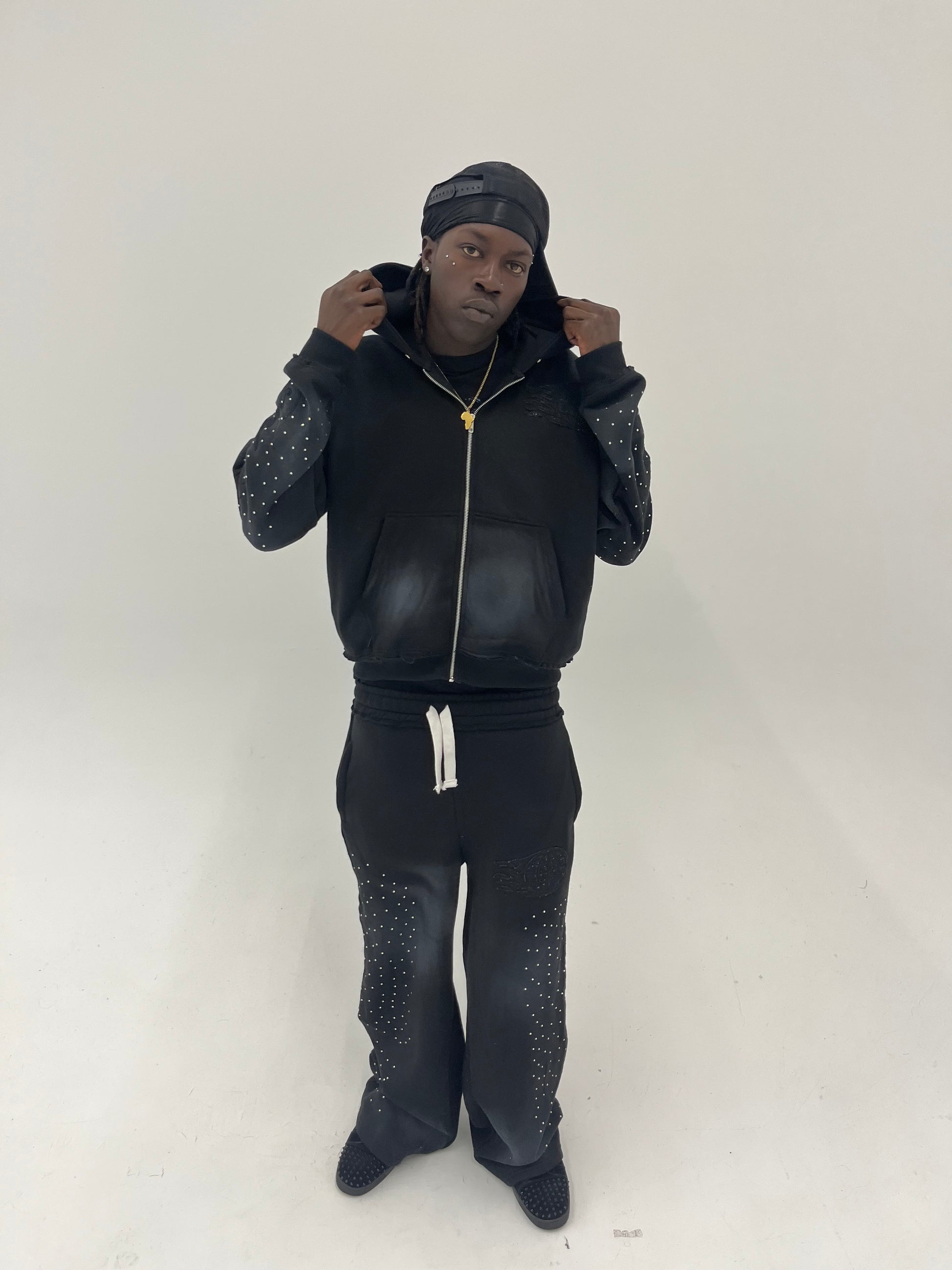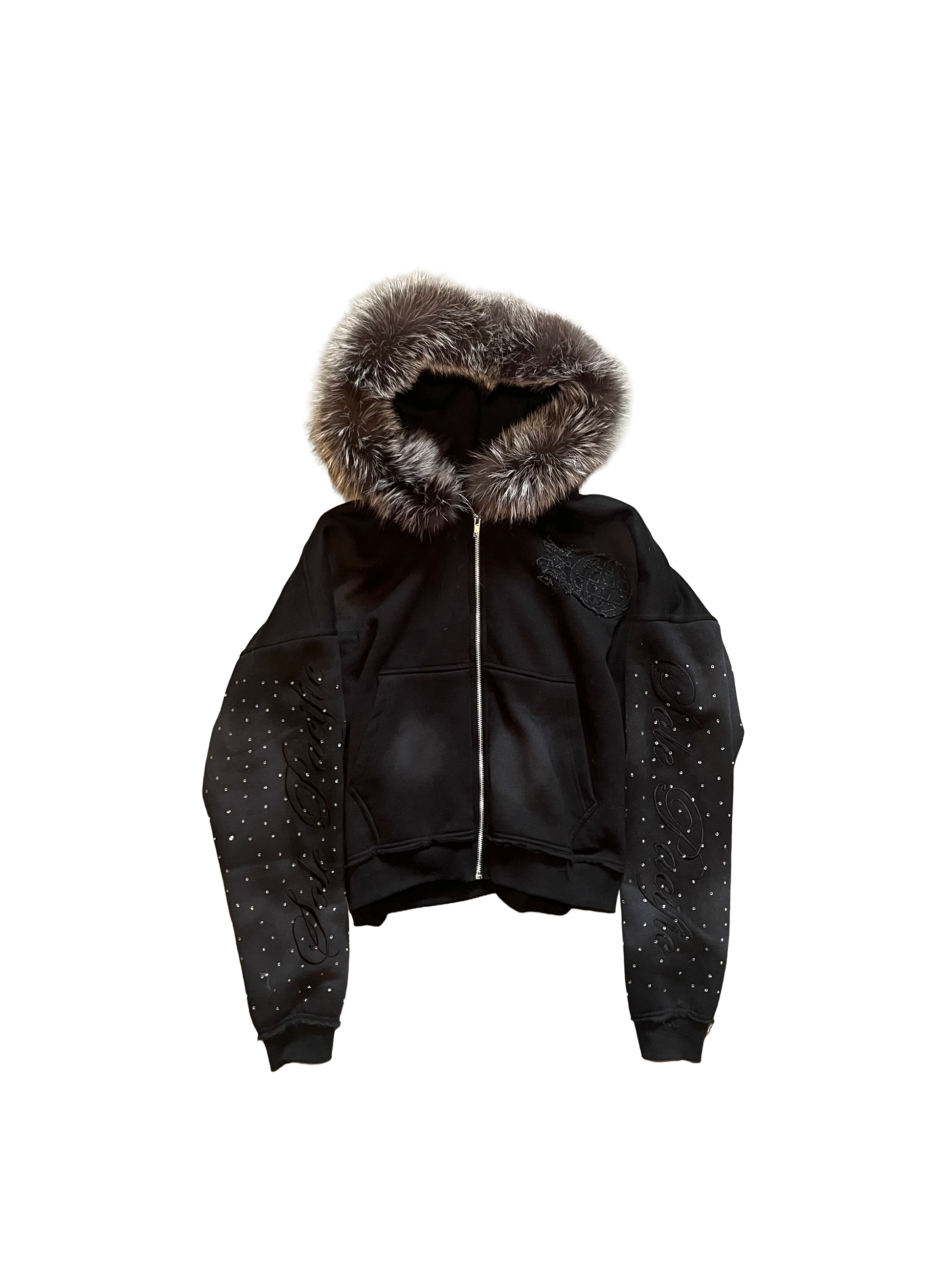 Sole Pacific returns with a familiar colorway, The Cursive Tracksuit. This set introduces a distressed double waistband for layered depth, while a detachable fur hood adds versatility and edge. Along the sleeves and legs, rhinestone detailing catches the light, contrasted by sleek black embroidery of the Sole Pacific logo on the chest, back, and thigh. The sleeves and legs are further elevated with engraved Sole Pacific embroidery in black, reinforcing the brand’s signature identity.